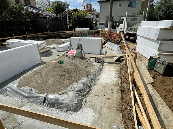 捨てコンクリートを打った状態の地面は凸凹しているのに、どうやって板状の断熱材を並べていくのか?答えは下の写真にも写っている「砂」です。砂で表面を均して、その上に隙間なくパフォームガードを敷き詰めていくのです。