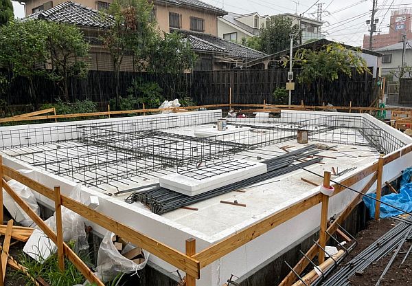 パフォームガードの上に配筋を組んでいきます。左の方に配筋が密になっている箇所がありますが、これは地中梁(ちちゅうばり)です。耐震等級3の家を建てるために必要な構造体です。