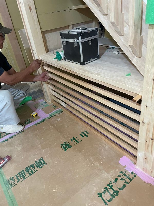 階段下のルーバーも彼の手によるものです。ルーバーの向こう側は床下エアコンの設置スペースです。
