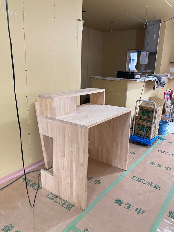 下の写真は、洗面室に設置するガス衣類乾燥機「乾太くん」用の収納ボックス兼家事カウンターです。収納ボックスといっても、乾太くんは本体の周囲を箱などで囲むように設置することが禁止されています。万が一故障した時に修理できないからです。