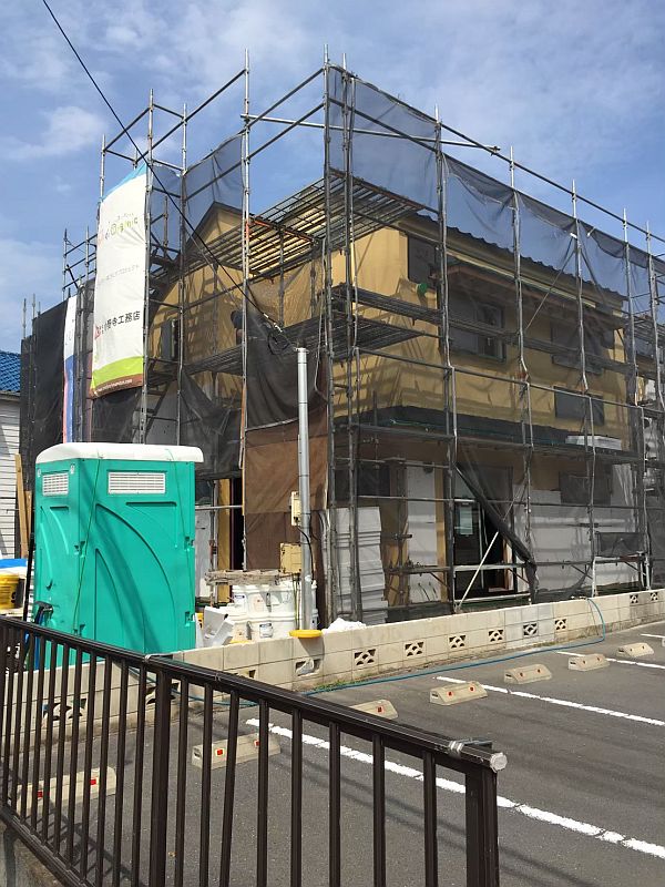 ここからはO様邸の外壁工事の様子を早送り的に紹介したいと思います。下の写真は付加断熱(外断熱)用の断熱材「EPSボード」を貼る前のO様邸です。家の外に白い板状のものが積まれていますが、これがEPSボードです。南極の昭和基地にも使われている強力な断熱材です。O様邸の外壁が黄色いのは、防水気密塗料のゴールドコートを塗っているからです。