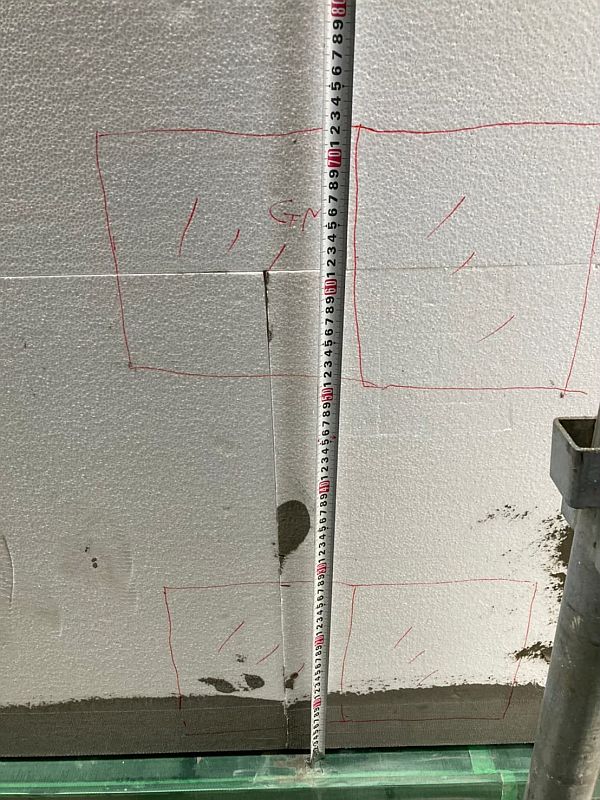 EPSボードを専用の接着剤を使って、パズルのように家の外壁全体に貼り付けていきます。赤枠は補強材を入れる位置を示しています。EPSボードは釘やネジの保持力がほとんどないので、ガスメーターや換気扇のガラリなど、外壁になにか取り付ける場合はその位置にあらかじめ補強材を入れておく必要があるのです。