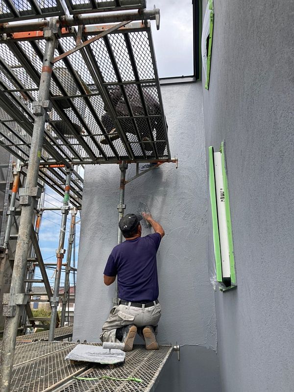 下塗り材がしっかり乾いたら、ガルデという塗り壁材を塗っていきます。ガルデは大理石を主成分とした天然成分の塗り壁材です。ジョリパットなどのアクリル塗料を混ぜた塗り壁材は、時間が経つとアクリル塗料の成分が色褪せしてきますが、ガルデはほとんど色褪せしないのが特徴です。(そのかわりカラーバリエーションが少ないのが弱点です)