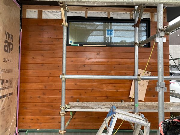 O様邸の外壁の一部にはウェスタンレッドシダーの板張りを採用しています。小野寺工務店ではエコウッドトリートメントというメンテナンスフリーの保護材を使用することが多いですが、今回は明るいブラウンの色合いがご希望でしたので、オスモカラーという別の自然塗料を塗っています。余談ですが、ウクライナ紛争の影響でウェスタンレッドシダーの入荷がほとんどなく、価格も高騰しています。数年後は幻の建材になっているかも知れません。