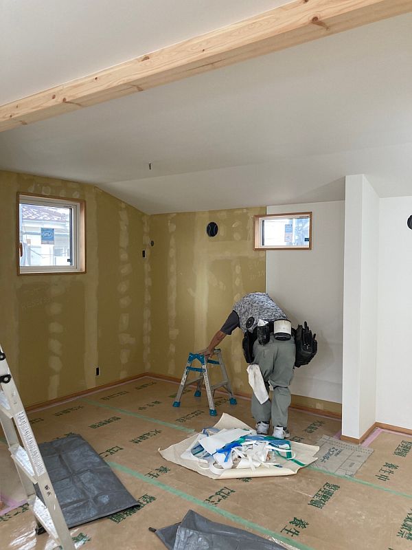 再び家の中に戻ると、壁紙工事が順調に進行しています。O様邸で使用するのは紙クロスのエコフリースです。壁の中に入れたセルロースファイバー(充填断熱材)の調湿性能を十分に生かすため、ビニールクロスではなく紙クロスをおすすめしています。