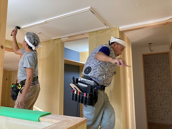 エコフリースを慎重に施工する職人さんたち。紙クロスはビニールクロスに比べてかなり薄いので、作業に慎重さが要求されます。