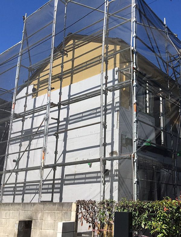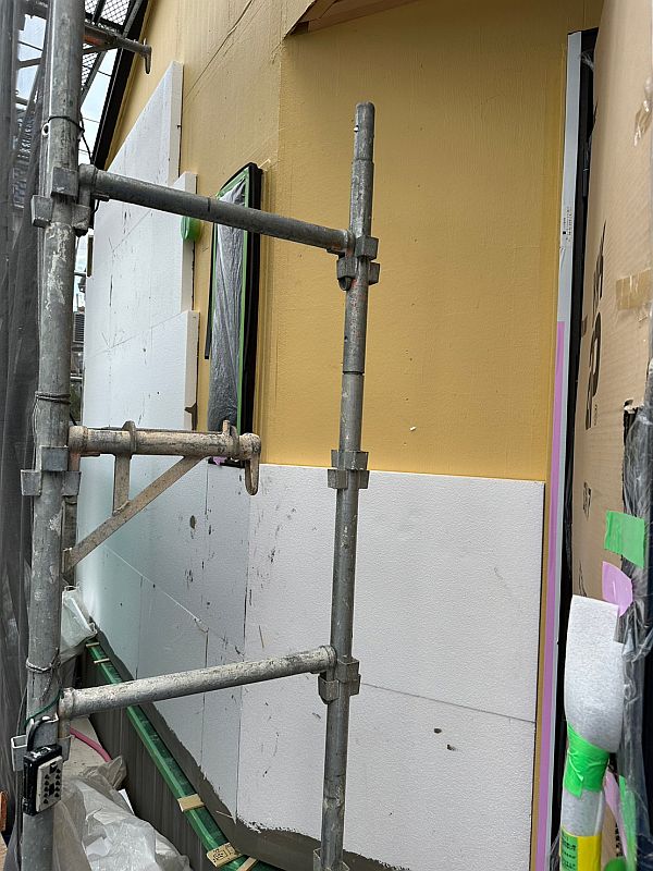 EPSボードですっぽり包み込まれたI様邸。表面がグレーなのは、EPSボードの上から保護材のベースコートを塗っているからです。この上から外壁用の塗り壁材を塗って仕上げていくのですが、その様子は来月号で紹介します。