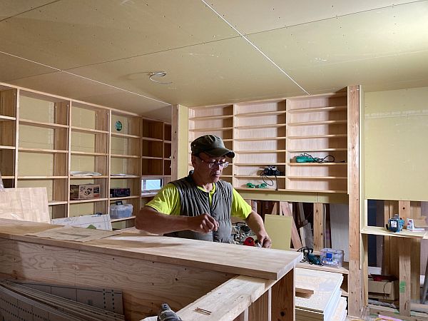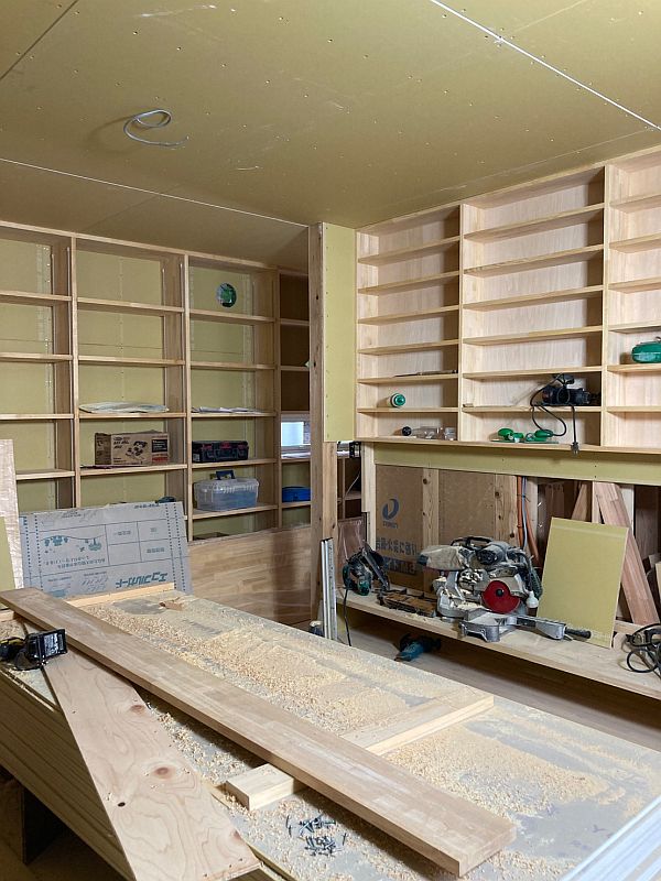 家の中では造作工事が着々と進んでいます。下の写真はリビング南側の壁面書棚です。