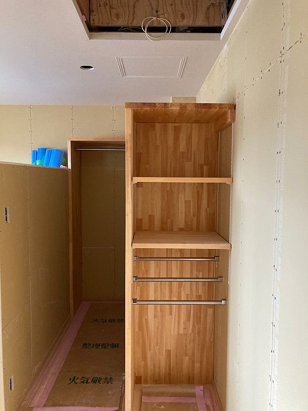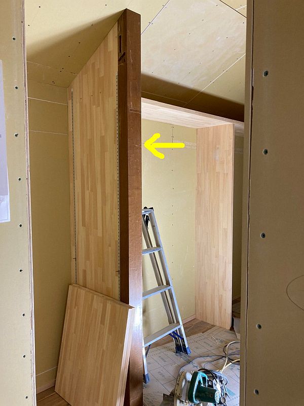 建て替え前の家から持ってきた柱の設置も終わりました(黄色い矢印の柱です)。設置した場所はファミリークローゼットの中。なぜここか?といいますと、柱の長さが足りず、母屋下がりのこの場所が長さ的にぴったりだったからです。思い出の床柱をどこかに使いたいというI様のご要望にお応えすることができました。