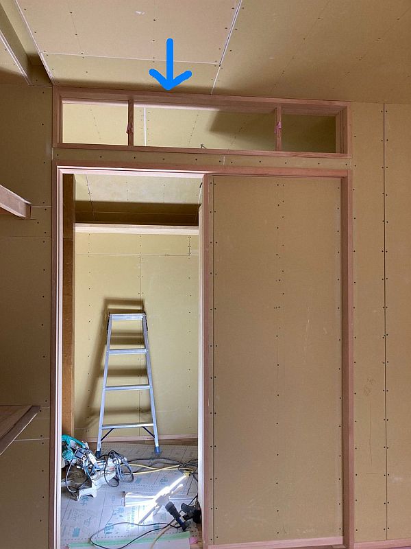 下の写真は、ファミリークローゼットの入口です。引き戸の上に細長い開口部(青い矢印)がありますが、ここには前の家で使っていたレトロなガラスが入ります。どんな雰囲気に仕上がるか楽しみです。