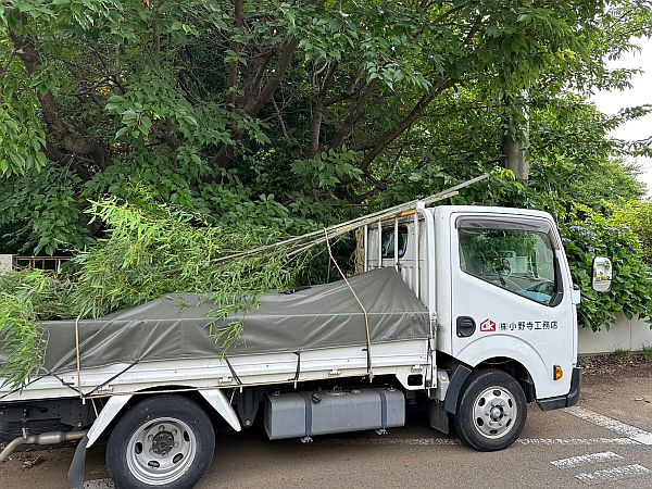 最近は地鎮祭を行わず簡易的な土地のお清めだけで済ますことも多いですが、正式に神社さんにお願いする際には、竹を立てておごそかに行います。このような竹はだんだんと入手することが難しくなっていますが、小野寺工務店にはこのように貴重なお客様がいて助かっています。A様いつも本当にありがとうございます。