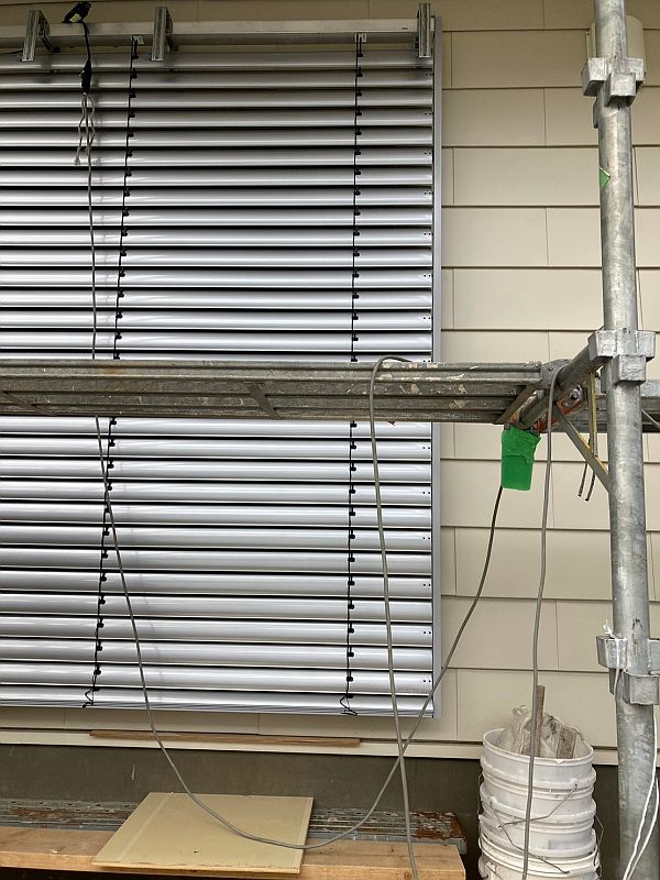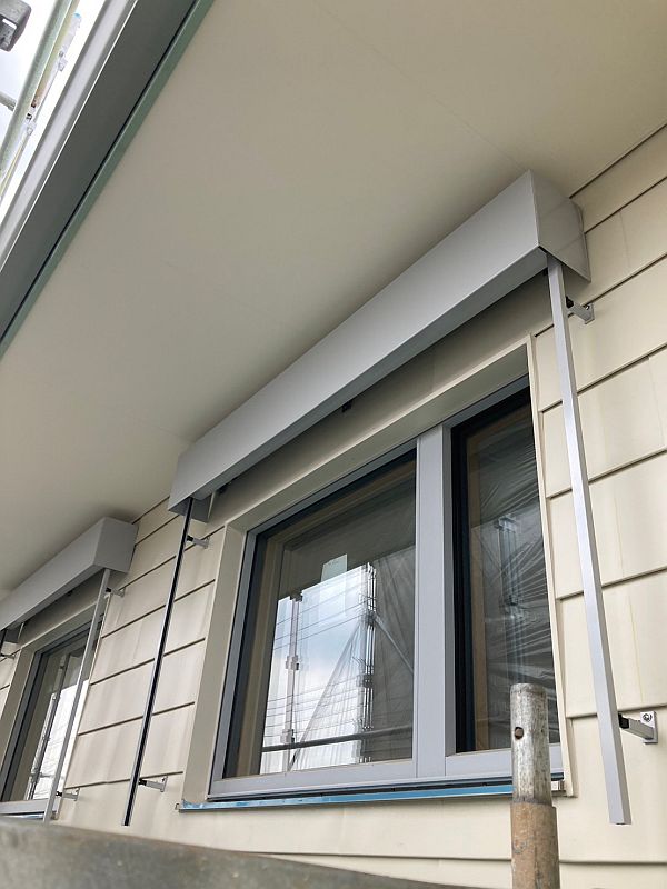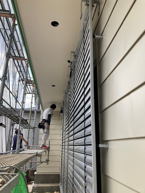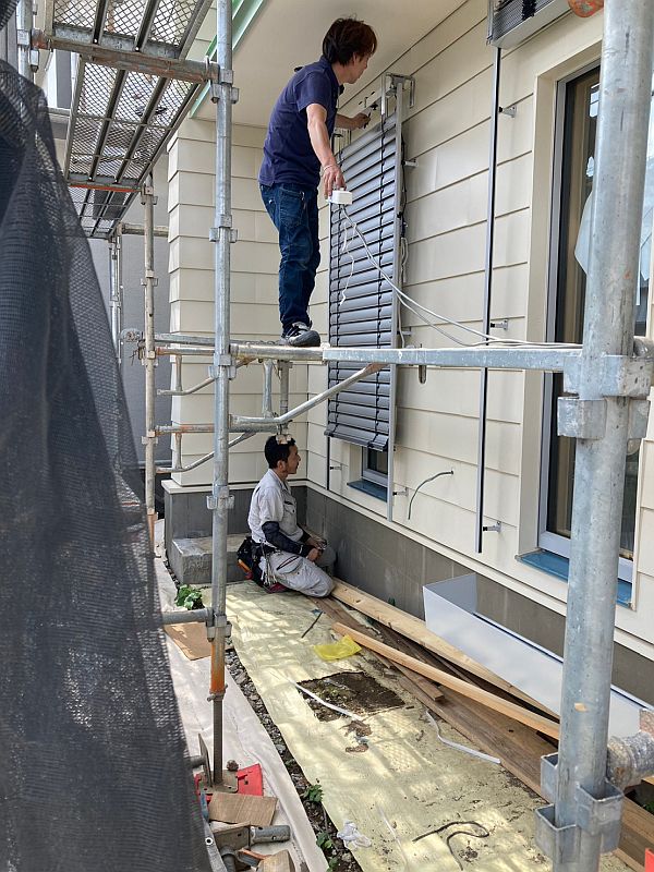 外壁工事が終わり、T様邸ではドイツ製の外付けブラインド「ヴァレーマ」の設置工事が始まりました。