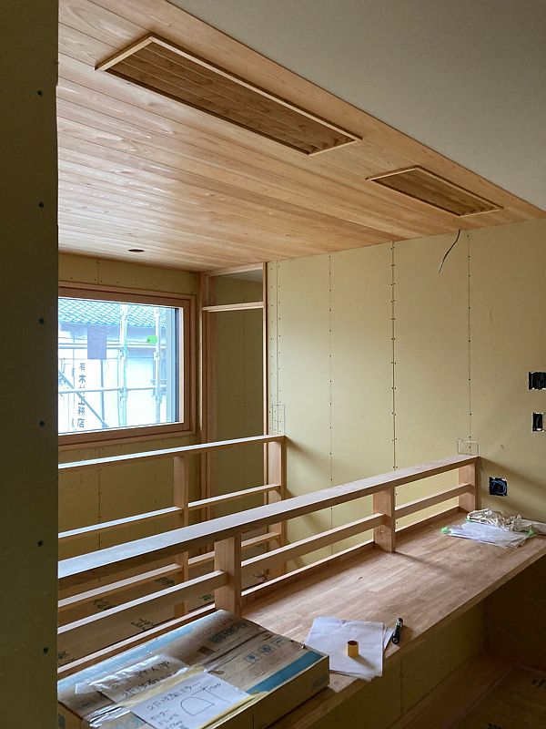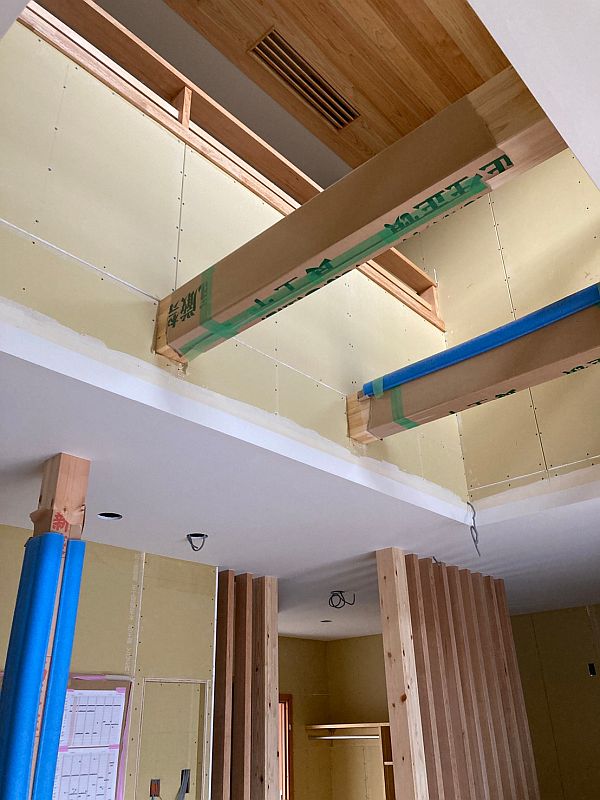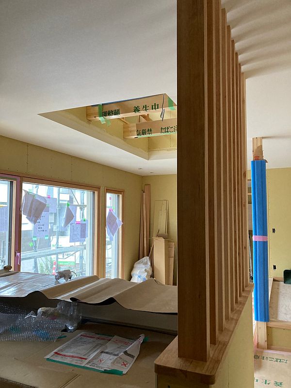 ここからは家の中の様子を紹介していきます。屋内では大工工事がほぼほぼ終わり、これから内装工事が始まります。T様邸の内装は珪藻土仕上げが基本で、天井だけ紙クロスを貼ります。天井の下地材は壁に比べると固定度合が弱く、地震等の揺れが長年積み重なると珪藻土がひび割れてきます。そういったことを避けるために天井だけ紙クロスというわけです。