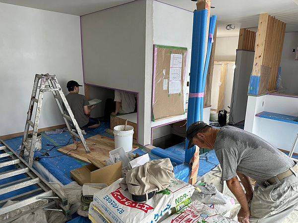 左官職人さんが入って、珪藻土の塗りが始まりました。