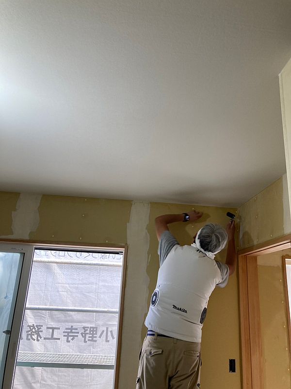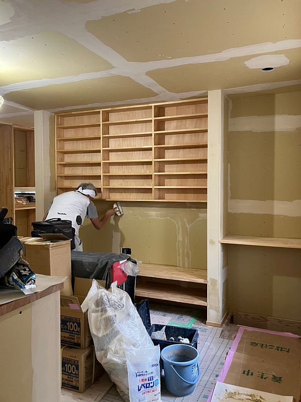 下の写真はリビングのCD兼文庫本棚の下のややこしい部分にパテ処理を施しているクロス工事の職人さん。パテ処理とは下地材の継ぎ目やビスの頭をパテできれいにならしていくこと。小野寺工務店が使う紙クロス(エコフリースなど)は、一般的なビニールクロスと比べてかなり薄いので、丁寧にパテ処理をしておく必要があります。