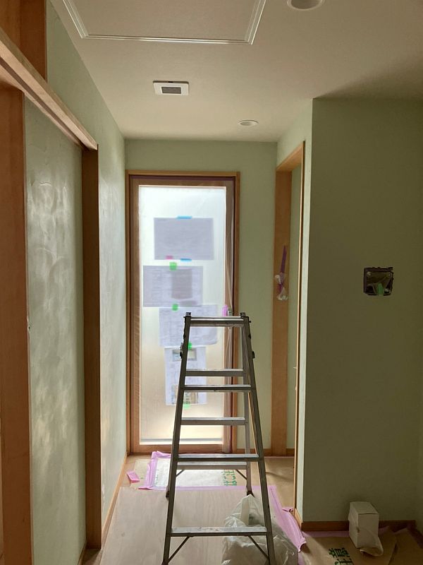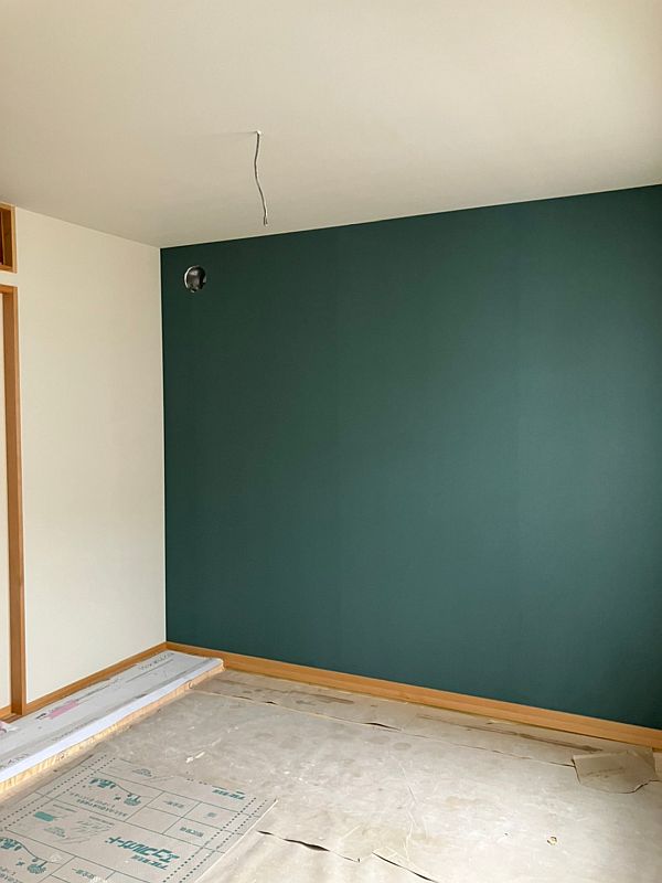 エコフリースを貼る作業が始まりました。エコフリースは一般的に紙クロスに分類されることが多いですが、詳しく説明すると、フリース(不織布)素材に水性塗料仕上げを施した壁紙です。艶のない水性塗料仕上げのため、塗り壁のような質感に仕上がるのが特徴です。