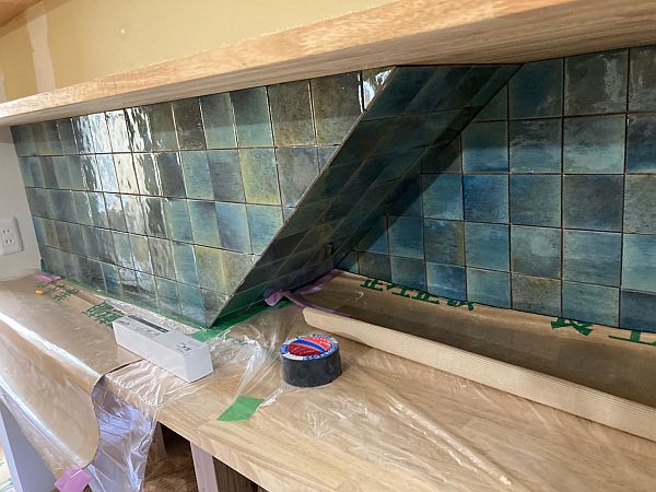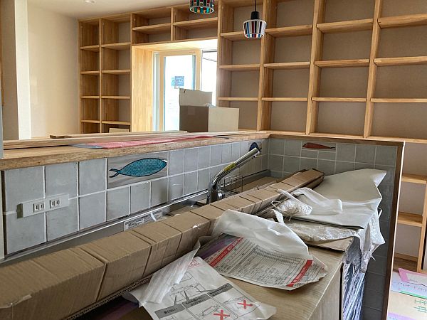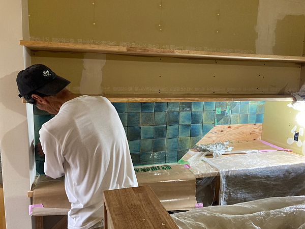 下の写真の男性はタイル職人さん。キッチンの後ろの壁に海の中のような色合いのタイルを一枚ずつ貼っていきます。