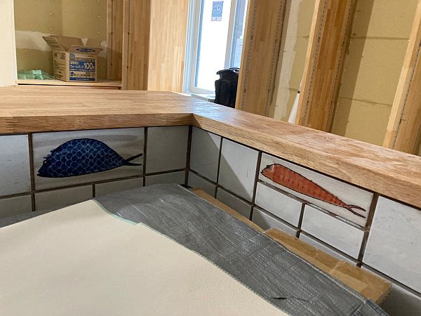 キッチンの袖壁(内側)もタイル仕上げ。魚の絵のタイルはイタリア製の手描きタイルです。