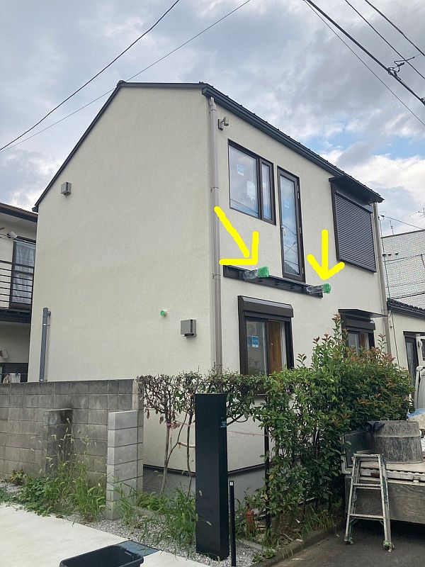 外壁工事もすっかり終わりました。黄色い矢印はこれから据え付けを行う外付けバルコニーの台座です。