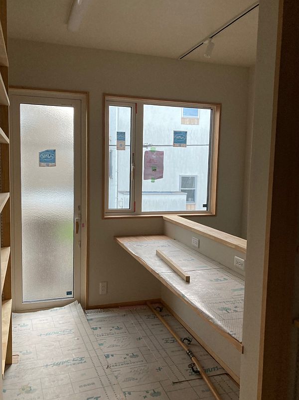 書斎の一本足のL字型カウンターテーブルもできあがりました。天板が壁の中に入り込んでいて、壁の中でしっかり支えているのです。これぞ造作家具というかんじです。
