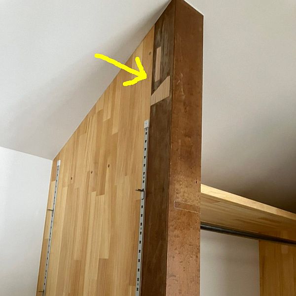下の写真は、ファミリークローゼット入口の飾り柱として再利用した前の家の思い出の床柱。鴨居が刺さっていた部分が欠けていたので、木片で埋めておきました。木細工のようでかわいいですよね。