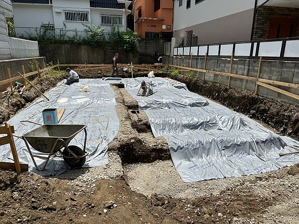 下の写真は、掘り下げた地面の上に防蟻剤入りの防湿シートを敷いている様子です。