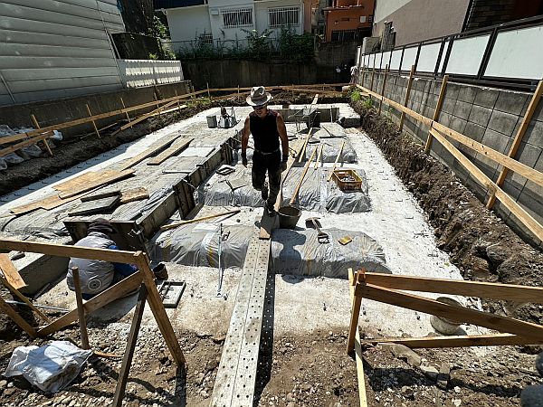 防湿シートを抑え込むように捨てコン(捨てコンクリート)を打った状態。写真中央のパナマハットがステキな男性は基礎工事の職人さんです。