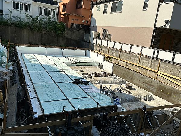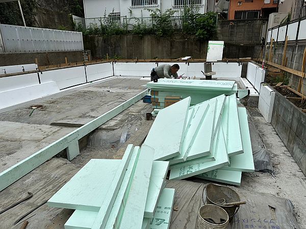 薄緑と白色のボードは基礎用の断熱材です。小野寺工務店は建物の基礎をすっぽりと断熱材で包み込む基礎断熱を採用しているので、基礎を作る前に断熱材を仕込んでおく必要があるのです。