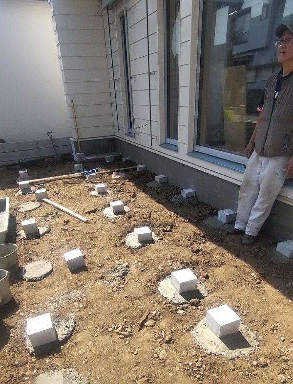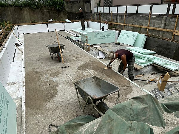 捨てコンを打った状態の地面はでこぼこしていて、そのままでは断熱材を敷くことができません。なので、砂を入れて、地面を平らにならしておきます。