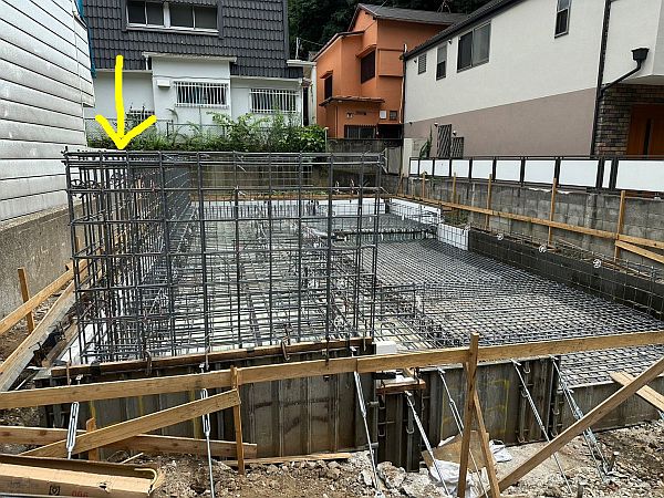 敷き詰めた断熱材の上から配筋を組んでいきます。黄色の矢印の部分をご覧ください。配筋が高く立ち上がっているのがわかりますでしょうか?この部分は基礎と一体化した擁壁(ようへき)になります。K様邸の敷地から少し離れた場所に急な斜面があり、東京都安全条例にしたがって、斜面側に擁壁を作る必要があるのです。