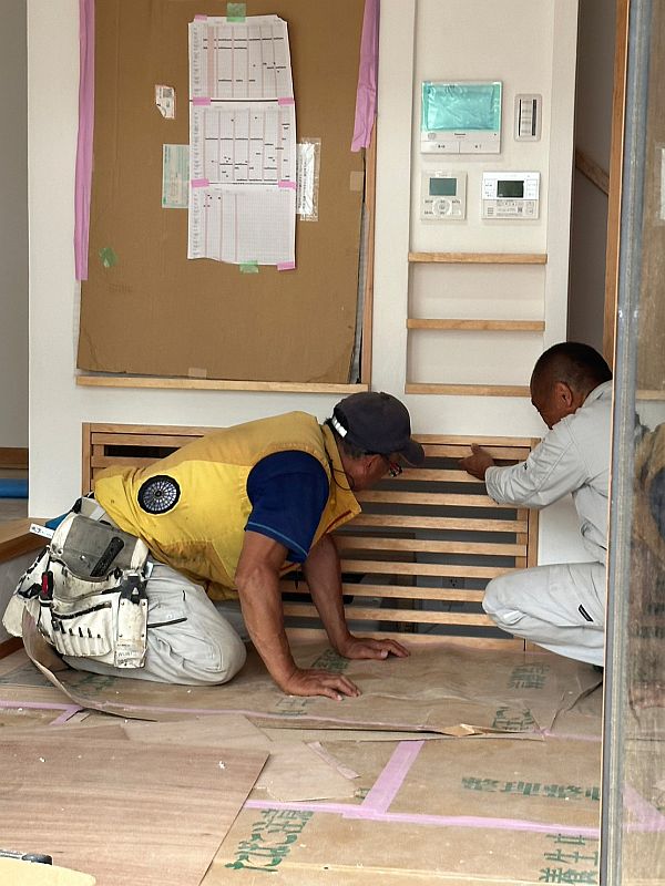 下の写真はルーバーの開閉具合をチェックする鈴川大工と現場監督。ルーバーの向こう側には床下エアコンが設置されています。