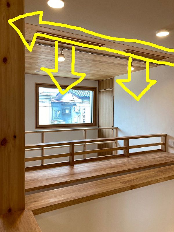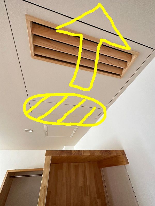 下の写真は主寝室の天井に開けた小屋裏エアコンからの冷気の吹き出し口。黄色い楕円印の上あたりにエアコンが設置されています。小屋裏エアコンから吹き出た冷気は、その一部分を主寝室に落とし、そのまま矢印の方向へ流れていきます。