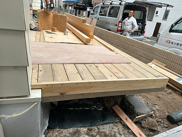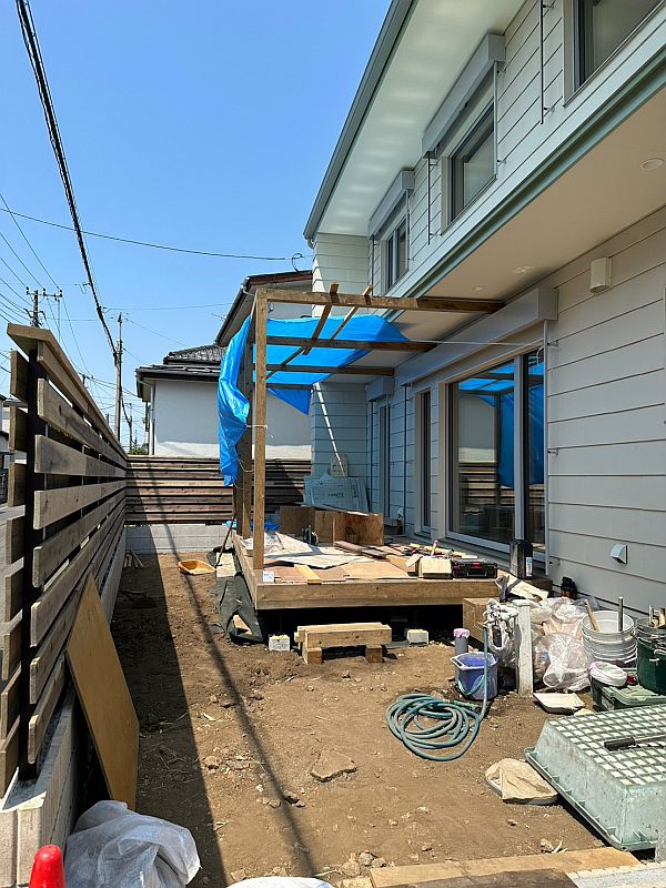 家の外では、外構工事が急ピッチで進んでいます。下の写真はウッドデッキの土台を作り終わって、小さな日陰で休息をとる職人さん。夏の外構工事は暑さとの戦いです。
