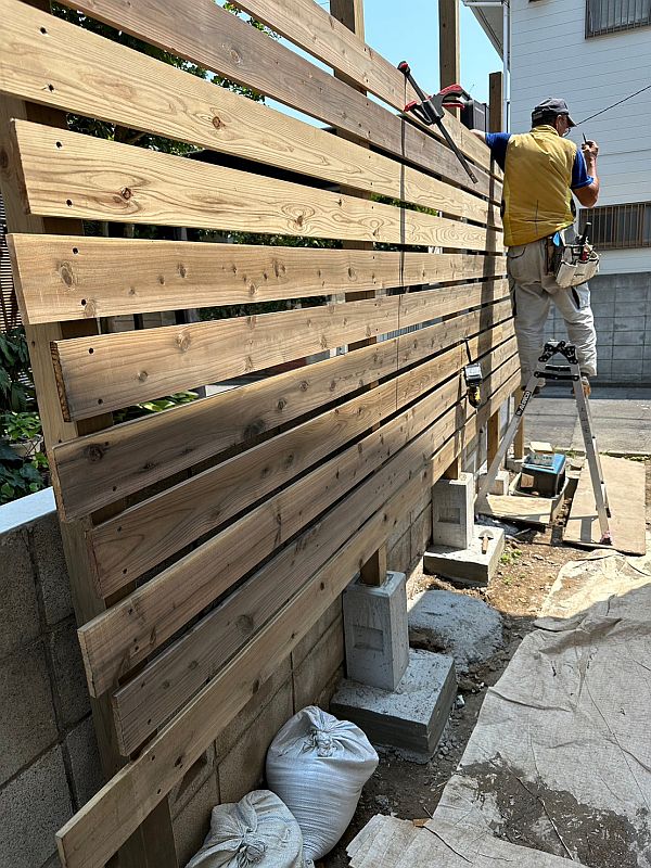 ウッドフェンスも着々とできあがっていきます。ウッドデッキはヒノキ製ですが、こちらは無垢の杉板を使って作っています。エコウッドトリートメント(木材保護材)を塗って醸し出された色合いがいい雰囲気です。