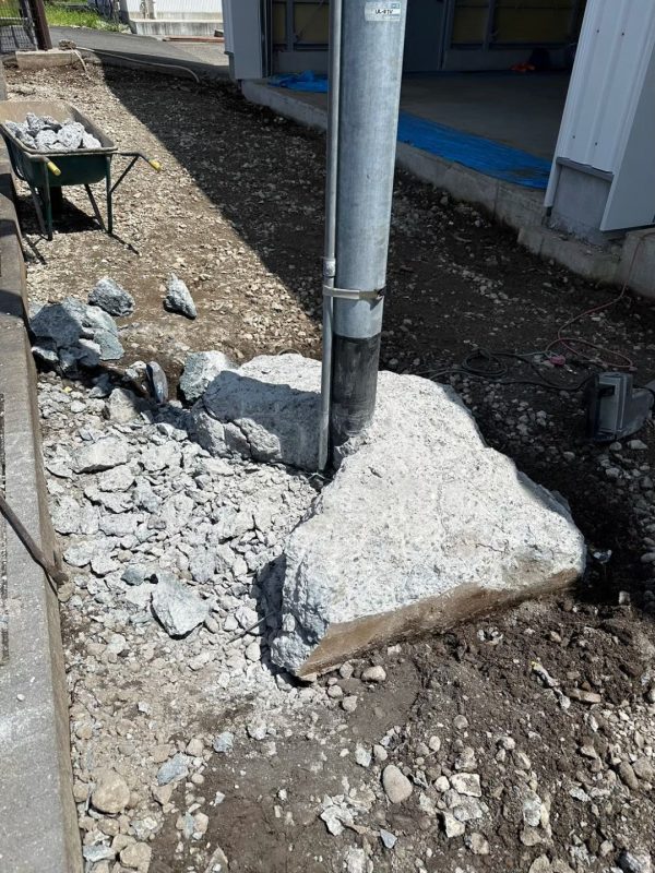 下の写真は、移設しようとして、根元のコンクリートを砕いたところ。このあと、地面の下にタテヨコ高さ1.5メートルほどの立方体のコンクリートが埋まっていて、そのコンクリートの塊が支柱をガッチリ固定していることが判明し、再利用を断念。根元を切断することにしたのです。