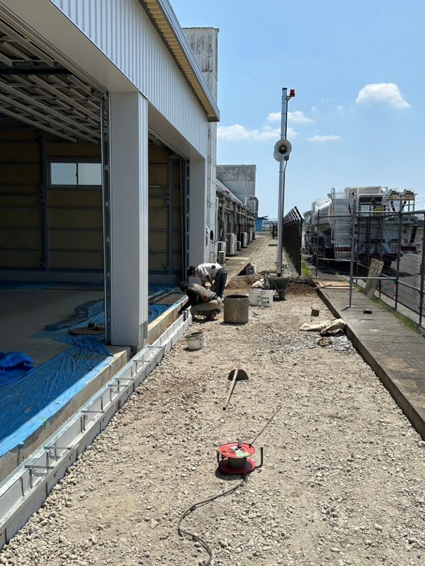 下の写真の左側に写っているのが完成した大型車庫です。飛行機に給油を行うタンクローリー格納用です。建物の右側に2本立っているのは、防災スピーカー用の支柱です。手前がこれから撤去する古いもので、奥側が新しいものになります。