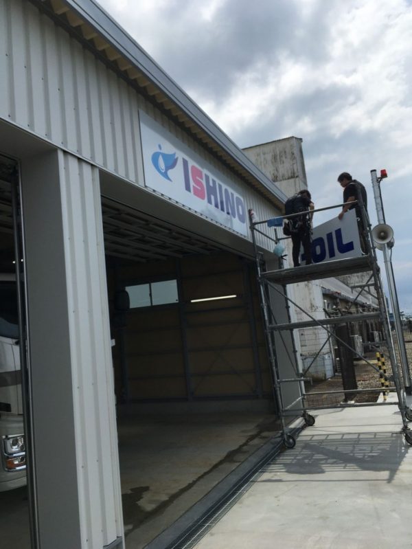 「ISHINO OIL」の看板を付けたら、工事完了です(完成後の写真は次回掲載します。ギリギリ間に合いませんでした)。