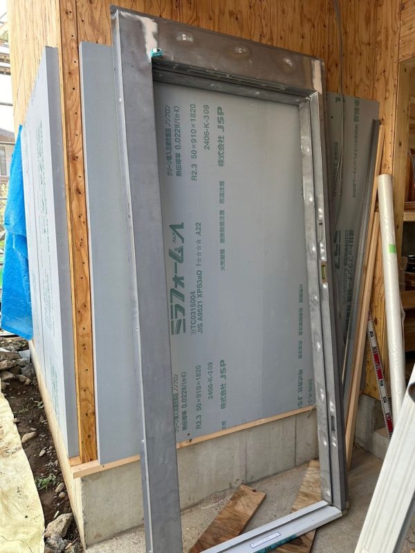 付加断熱用の断熱材として、いつもはEPSボードを使うのですが、K様邸の場合は、最終的に外壁全体を板張りにする関係で、50ミリ厚のミラフォーム(押出法ポリスチレンフォーム)を使用しています。