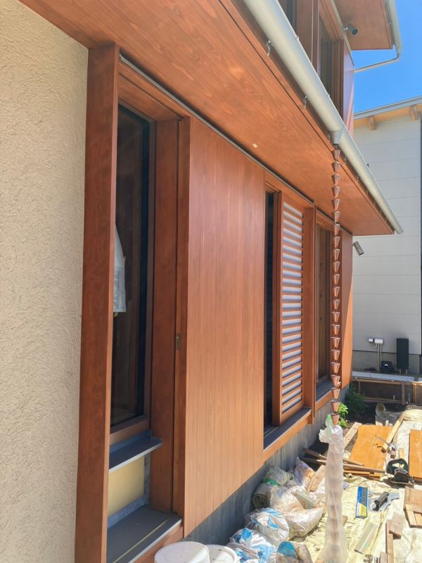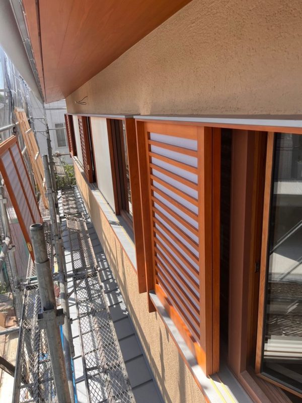 S様邸の外観デザインで、もっとも特徴的で印象的な造作が建物南面にずらりと並ぶ木製横格子です。下の写真は、できあがった木製横格子を2階の窓の外側にはめ込んでいるところです。