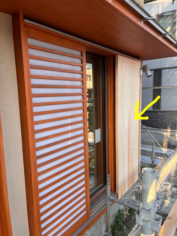 こちらは1階の木製横格子です。2階のものより縦長サイズです。黄色矢印の板は、木製横格子を収納する戸袋の鏡板(かがみいた)。このあと、横格子や軒天と同じ色に塗装します。