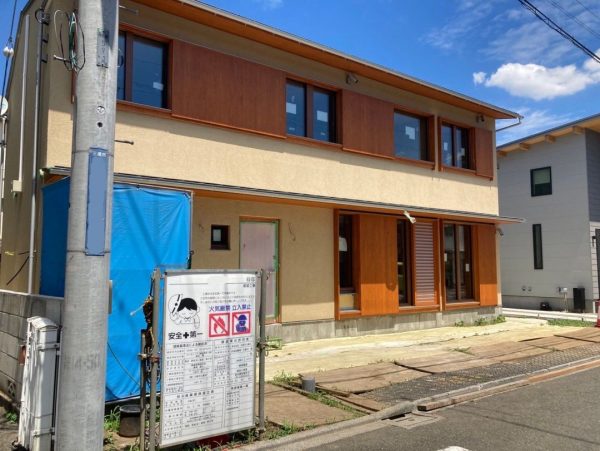 木製横格子および木製鏡板がすっきり収まった状態のS様邸。これから玄関アプローチなどの外構を作っていきます。