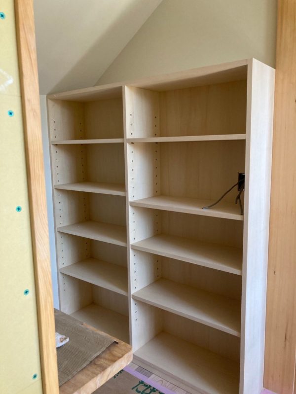 扉のない収納の可動棚はすべてダボ穴タイプにしたい、というご要望をいただいたので、全部で何百というダボ穴をあけました。目を閉じると瞼の裏にダボ穴が見えるくらい、それはそれは大変な作業でした。