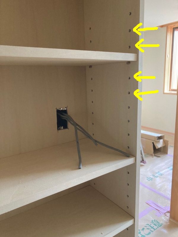 手間の理由は、可動棚を支えるダボ穴(下の写真の黄色矢印)です。市販の収納棚にもよくあるダボ穴ですが、造作で作るとなると、とても大変なのです。