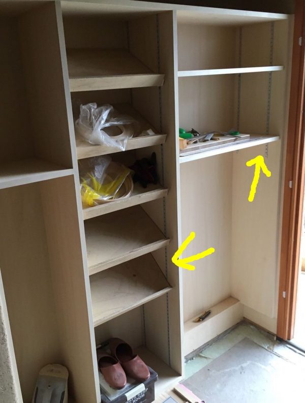 下の写真は玄関のシューズクローク。シューズクロークには扉が付くので、ダボ穴ではなく一般的なステンレスの棚柱(黄色矢印)を付けています。ダボ穴式に比べて、100倍楽です。徒歩と新幹線ぐらい違うかもしれません。