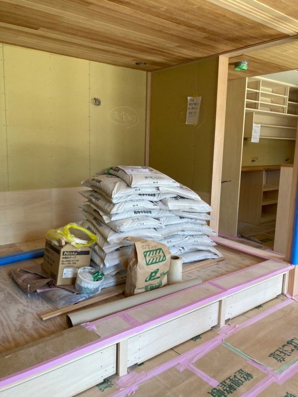 S様邸の内壁の大部分は、九州産のシラス(火山灰)を主成分にした薩摩中霧島壁という天然素材の塗り壁材を使います。下の写真の中央、小上がりの和室の床に積まれているのが、これから塗る薩摩中霧島壁です。