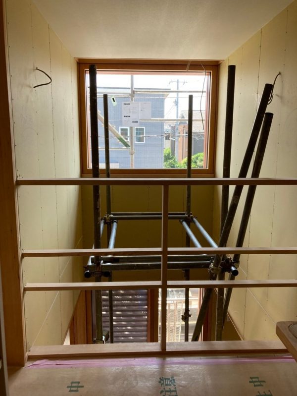 内部足場を組んで、吹き抜けに面した壁から塗っていきます。