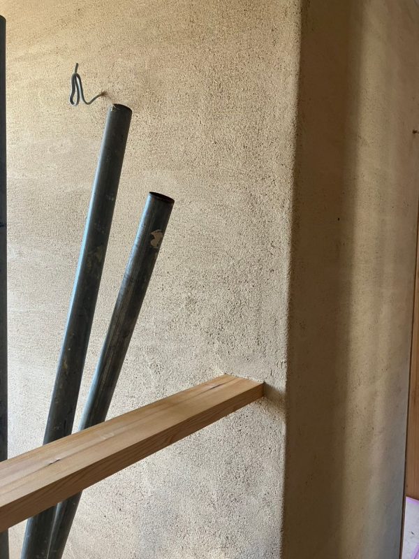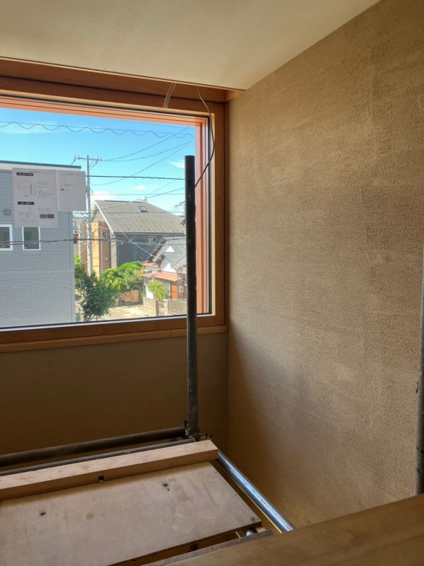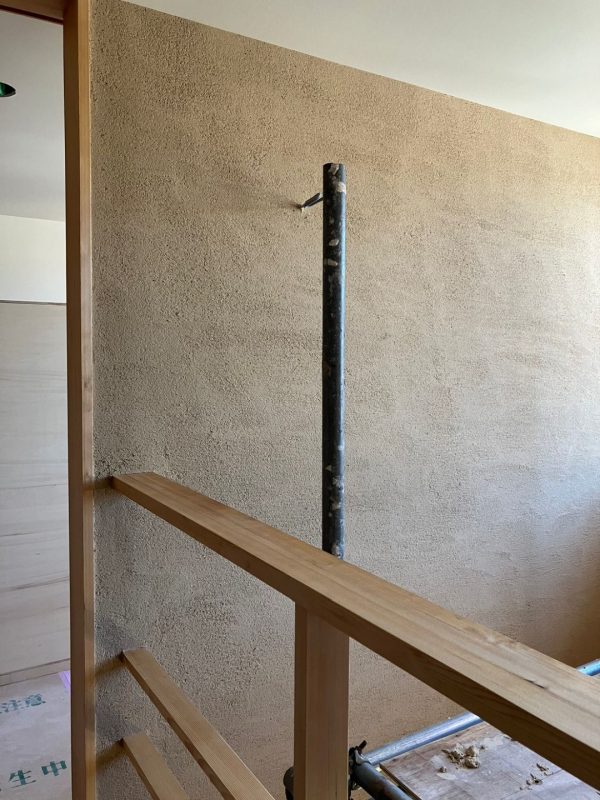 塗り終えました。木ゴテを使って5ミリの厚さに塗っています。薩摩中霧島壁にはいろんな色があるのですが、S様は黄土色のような、砂色のような色を選ばれました。なかなか雰囲気がありますね。