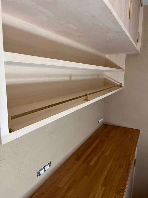 S様邸のハンガーバーなどの金具類は、上手製作所の真鍮金具を使用しています。下の写真は、キッチンの背面カウンターに取り付けた落下防止用のバー。
