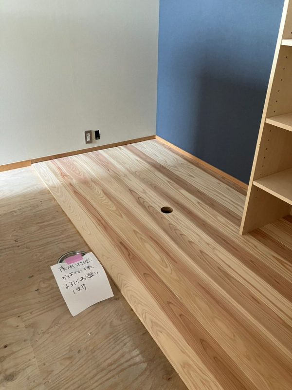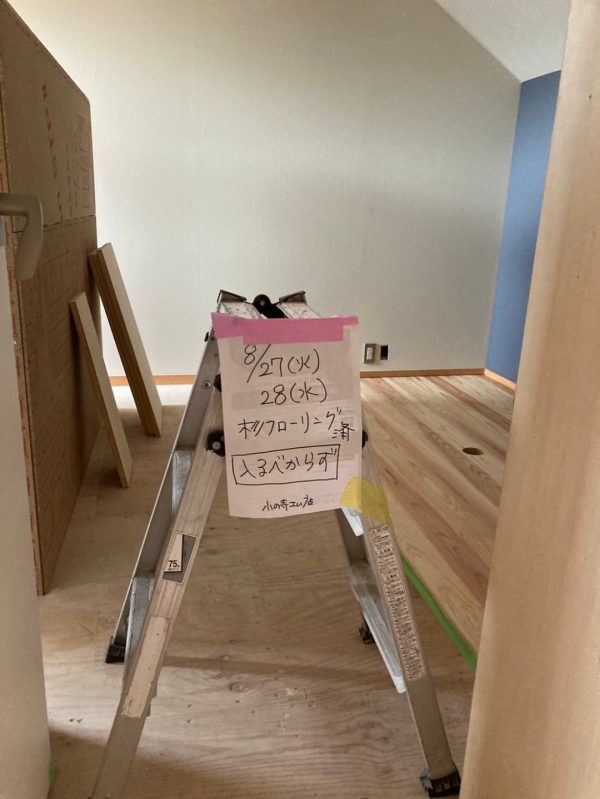 杉板の上に透明の保護塗料(オスモカラー)を塗り、電気工事の職人さんや現場監督がうっかりその上を歩いたりしないように、しっかり注意喚起。左側に少し写っている箱の中にピアノが収納されています。上棟日に搬入されてから、ずっとこの箱の中で身を潜めていたピアノ。解放の時は、もうまもなくです。