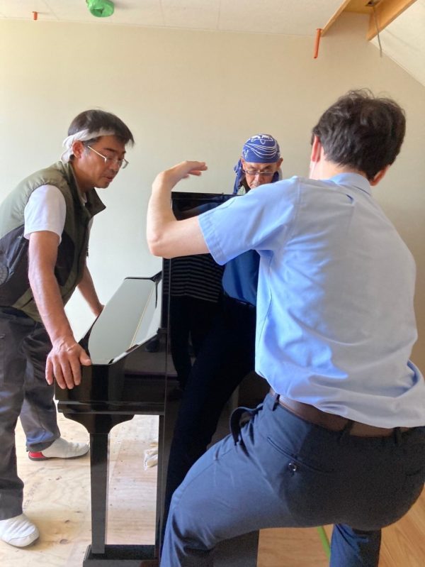 保護塗料がしっかり乾いたのでピアノを設置します。手前のスーツ姿の男性はピアノ屋さん。彼の指示に従って、ピアノを設置しました。